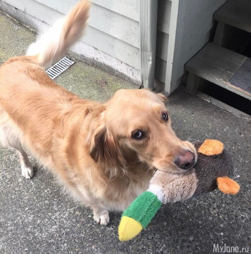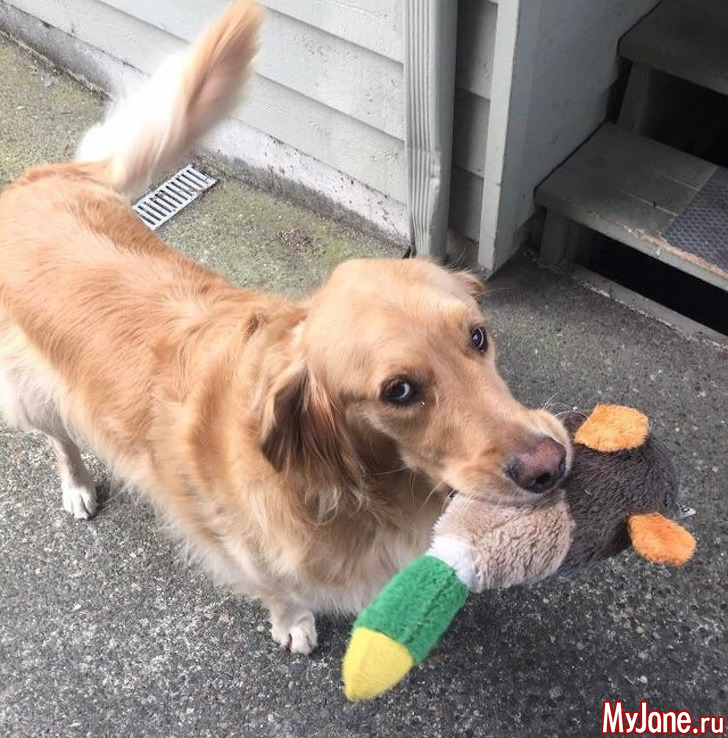 2. «Это Джаспер – соседская собака. Я не могу выходить из дома из – за проблем со здоровьем. Когда Джаспер видит меня, он возвращается домой и приносит одну из своих любимых игрушек. Сегодня это утка».