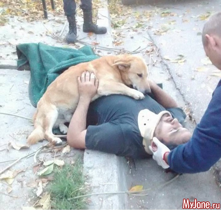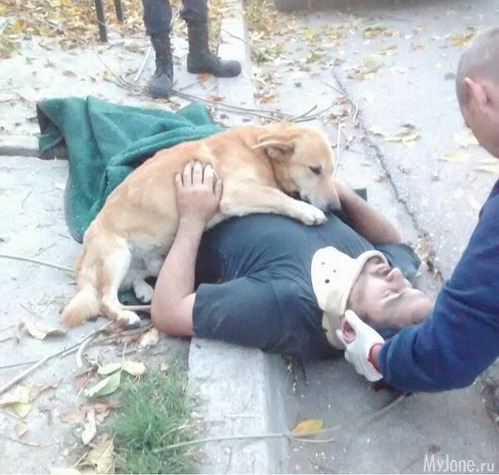 16. Пес не хочет отпускать своего хозяина, с которым произошел несчастный случай, в больницу.
