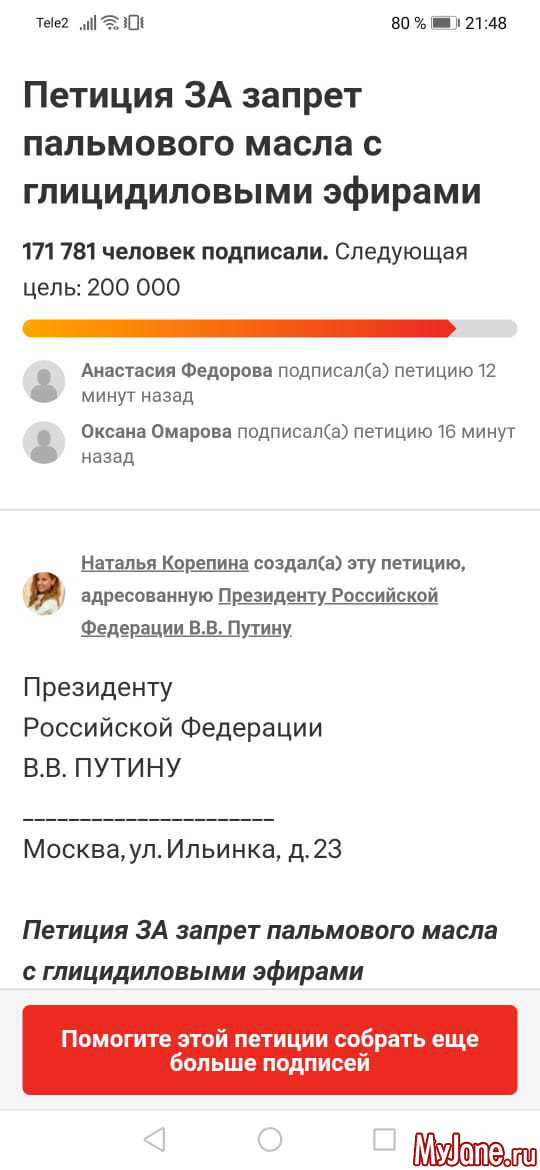 Просьба распространить информацию и подписать петицию! На change org - Перейдите на данный сайт, напишите в поиске: Петиция ЗА запрет пальмового масла с глицидиловыми эфирами. Петицию подписали уже более 170000 тысяч человек.