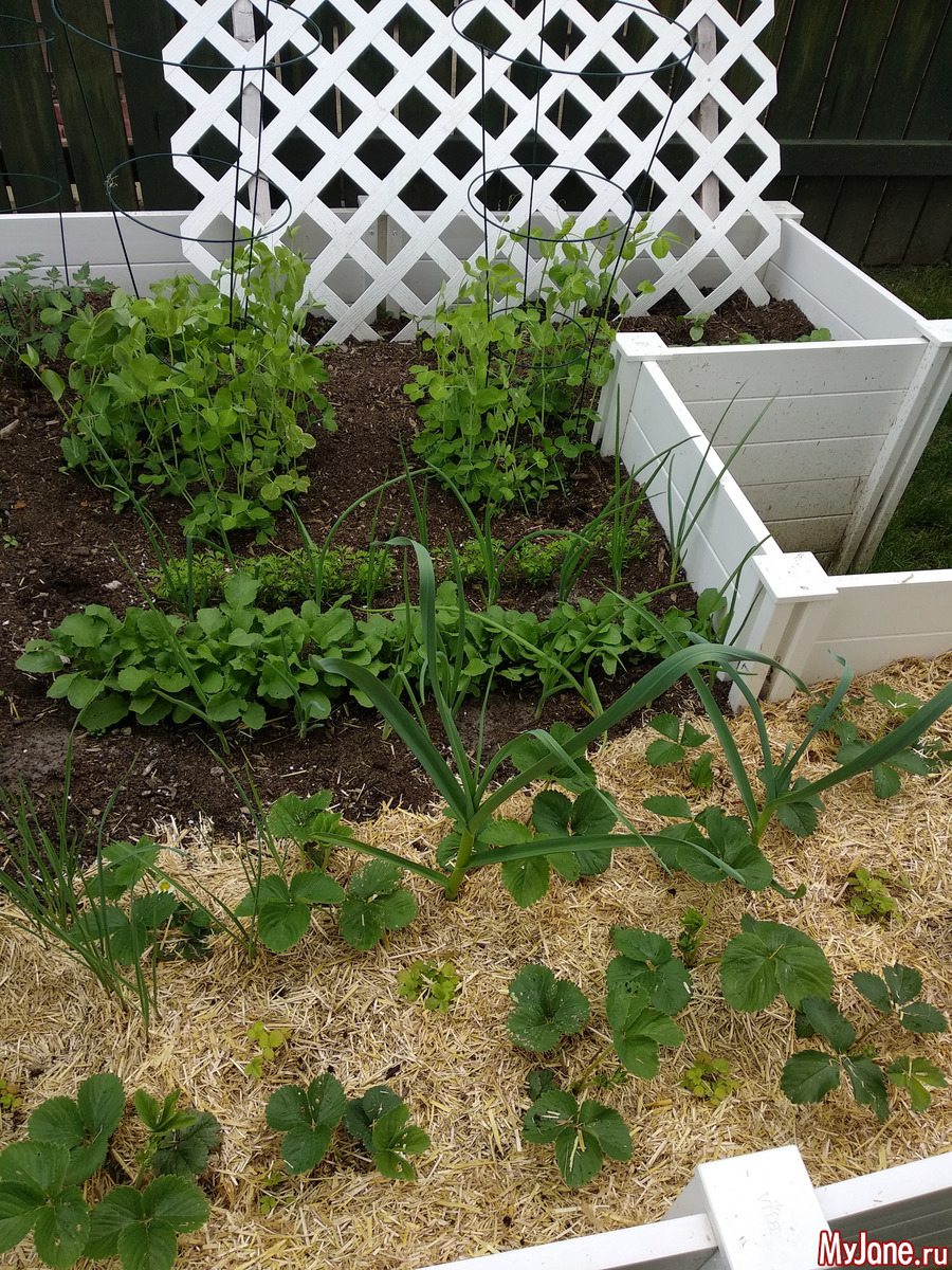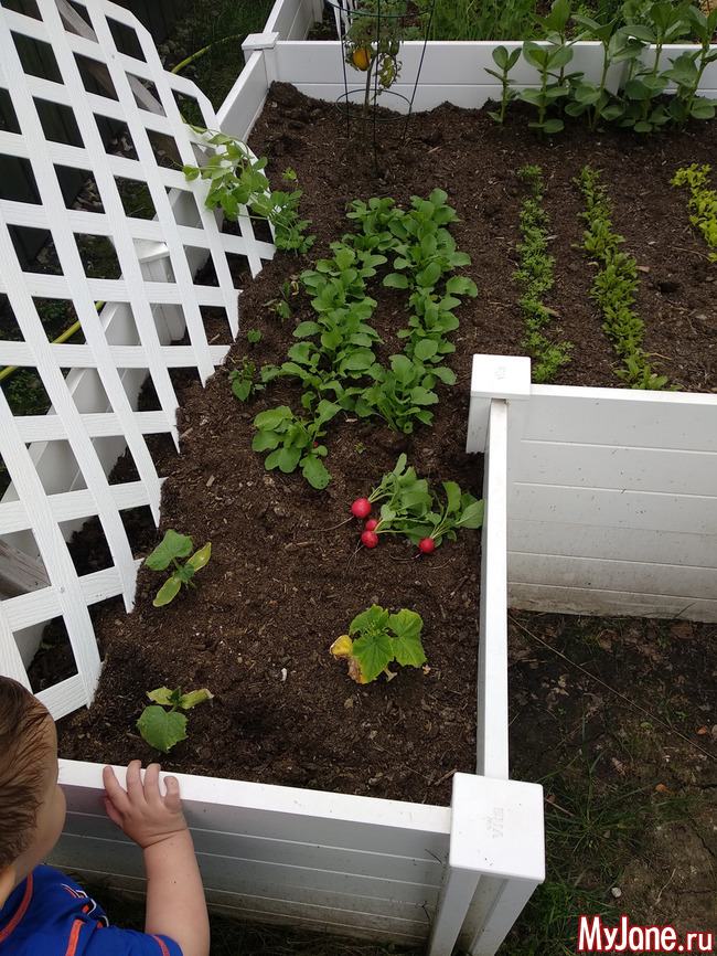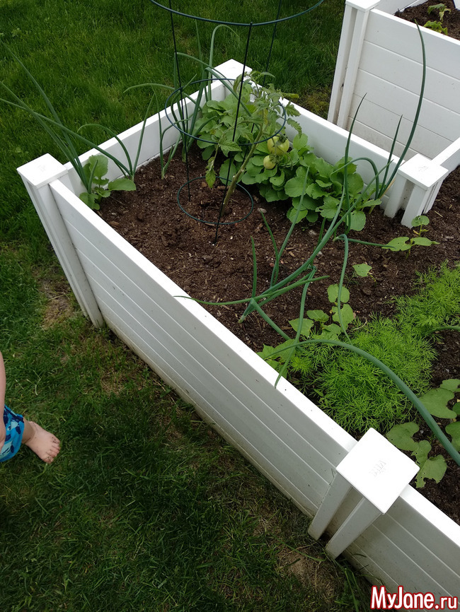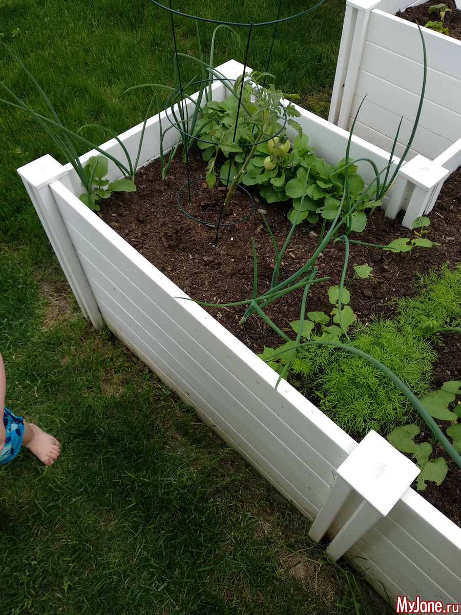 Лука до фига. Редиска уже можно начинать собирать. Фасоль не вся взошла. Салат тоже взошёл только на половину. Клубника и земляника все новые. Ещё посадила боб, swiss chard, морковь, горох, укроп, 3 сорта помидор, свеклу, чеснок. Ну и кабачок немного отдельно. А на клумбу впихнула зелень (орегано, тимьян, розмарин, базилик, мяту, хрен), щавель и 3 куста капусты + традиционные лук с чесноком и укроп. А вообще в этом году сбылась мечта - я посадила абрикосовое дерево!!! (Плюс сливу и черную смородину). И вообще начала мечтать о том чтоб нанять людей и переделать клумбу и сделать второй мини-огородик где сейчас кабачки