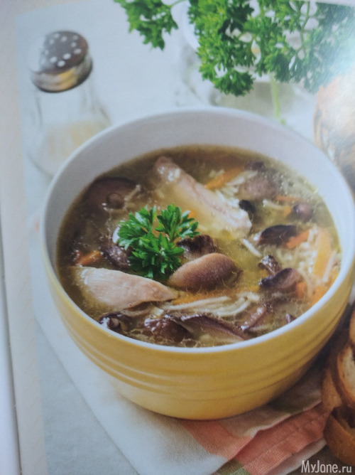 Курицу помыть, положить в глубокую кастрюлю, залить холодной водой и варить на медленном огне до готовности, добавив корень пастернака, соль и перец. Мясо вынуть, отделить от костей и нарезать. Грибы помыть, нарезать, положить в бульон и варить 10 минут. Лук, картофель и морковь помыть и очистить. Картофель нарезать кубиками, добавить в бульон. Готовить 10 минут. Лук измельчить, морковь натереть. Обжарить лук и морковь в растительном масле, выложить в суп. Всыпать вермишель и варить еще 3 минуты. Готовый суп разделить в тарелки и посыпать измельчённой зеленью. Ссылка на сайт: http://stillhand59.blogspot.com