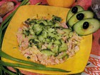 200 г свинины, 100 г кукурузы, 50 г фасоли, 50 г цветной капусты, 2 соленых огурца, 1 картофелина, 1 головка репчатого лука.