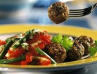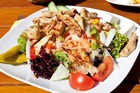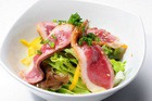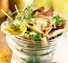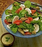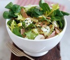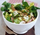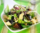 300 г тушеной баранины, 100 г чернослива (без косточек), 1 стебель лука-порея, 200 г отварных шампиньонов, листья салата, 2 помидора, 50 г грецких орехов.