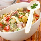 200 г копченой свинины, 100 г корнишонов, 3 отварных картофелины, 2 вареных яйца, 1 отварная свекла, 1 луковица, 1 помидор, 50 г сельдерея, 50 г эстрагона, 50 г листьев салата, майонез, соль.