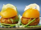 2 яйца, 2 персика, 300 г отварного мяса, 100 г зеленого горошка, 1 средняя небольшая спаржа, майонез, 1 апельсин, соль, зелень, 1 луковица.