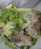 6 половинок персиков, 100 г отварной свинины, перец, 3 ст. ложки майонеза, зелень петрушки, соль.