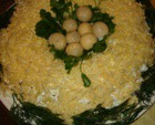 100 г грибов, 100 г копченой колбасы, 1 луковица, 1 вареная морковь, 1 вареное яйцо, 100 г тертого сыра, 1/4 кочана краснокочанной капусты, 5 ст. л. майонеза, 1 ст. л. изюма.