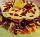 250 г капусты, 350 г вареного мяса, 2 картофелины, 1 яблоко, 4 яйца, 150 г зеленого горошка.