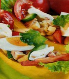 На 4 порции: 150 г мяса индейки, 2 спелых банана, китайский салат, 2 помидора, 200 г майонеза, корни сельдерея, зелень петрушки.
