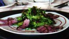 100 г куриной печени, луковица, 1 ст. л. растительного масла, 1/2 пучка листового салата, 10 мл винного уксуса, соль, молотый черный перец, сахар, оливки.