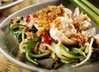 Окорочок - 400 г, яйцо - 2 шт., свежий огурец - 2 шт., пучок зеленого лука, чеснок, немного уксуса, готовой горчицы, соевого соуса и жареное кунжутное семя.