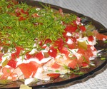Очень легкий в приготовлении салат. Выручит в случае прихода нежданных гостей. Подойдет тем, кто на "кремлевке". Вкусно и сочно, с пикантной легчайшей горчинкой!