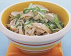 500 г куриных сердечек, 1 луковица, 300 г зеленой фасоли, 100 г грецких орехов, 5 яиц, 2 зуб. чеснока, майонез.