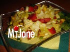 400 г ананасов (кружочками), 250 г отварных шампиньонов, 1 луковица, 5 вареных яиц, 2 куриные грудки, соль, майонез, готовая горчица.