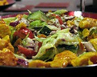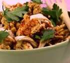 2 луковицы, 2 куриных грудки, пекинская капуста, майонез, 1 апельсин, 6-7 шт. чернослива, помидорки черри.