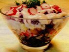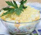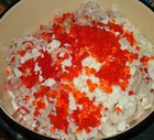 1 кг креветок, 250 г крабового мяса, 250 г крабовых палочек, 1 кг кальмаров, 1 баночка красной икры, 1 баночка мяса криля, 8 шт. вареных яиц, 250-300 г майонеза.