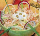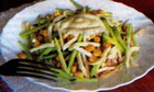150 г свежего, отварного или консервированного кальмара, 200 г свежей капусты, нашинкованной тонкой соломкой, 1 средняя по размеру морковь (отварная).