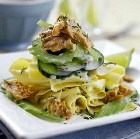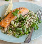 8 пластинок лазаньи, 240 г тертого сыра, 2 ст.л. лимонного сока, 3 ст.л. рубленой зелени, 2 банки консервированного лосося в собственном соку, 2 свежих огурца, 3 ст.л. майонеза.