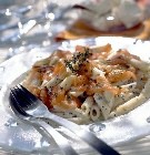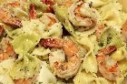250 г макарон, 200 г креветок, сок 1 лимона, 1 медовая дыня, 1 плод авокадо, 200 г сельдерея (кочанного), 1 пучок укропа, 2 ст.л. майонеза 50%-ой жирности, 150 г молочного йогурта, 3 ст.л. сливок, 2 ст.л. коньяка, соль, по щепотке белого и кайенского перца.
