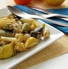 125 г микса из рукколы и корна, 8 шт. моркских гребешков, 1 цуккини, сок лимонный, сливочное и оливковое масло, мята, чеснок.