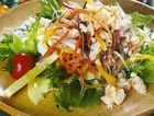100 г вареных кальмаров, 100 г вареных трепангов, 100 г морского гребешка, 50 г вареных креветок, 100 г свежих огурцов, маслины, 100 г маринованных грибов, 200 г майонеза, перец, соль по вкусу, зелень петрушки.
