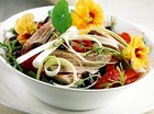 300 г подготовленной хамсы, 2 помидора, 2 огурца, 3 картофелины (отварных), горчичная заправка, зелень петрушки, листья салата, соль по вкусу.