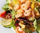 2 авокадо, 200 г креветок, листья салата, сок лимона, 3 подмидорки черри, масло оливковое, коньяк.