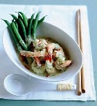 4 ст.л. растительного масла, 1 луковица, 1/4 ч.л. свежего имбиря, 4 зуб. чеснока, 1 ст.л. тертой цедры лимона, 1 ст.л. куркумы, 1/4 ч.л. молотого кориандра, 100 г сухого концентрата кокосового молока, 2 зеленых перца чили, 500 г тигровых креветок, 2 ст.л. свежей кинзы, 250 г бамии, 150 мл воды.