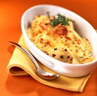 1 кг рыбного филе, 200 мл сливок, 150 мл бульона, 2 ст.л. тертого сыра, 3 ст.л. муки, 50 г сливочного масла, 1 ст.л. вермута, 2 ст.л. горчицы, 2 ч.л. крахмала, зелень петрушки и укропа, соль, черный молотый перец.