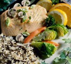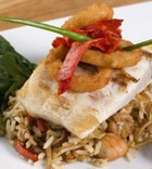 600 г свежей рыбы (филе с кожей), перец черный горошком и соль по вкусу, 1 луковица, 50 г маргарина, 500 г молочного соуса, 50 г тертого сыра, 30 г сливочного масла, 400 г отварного риса.