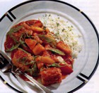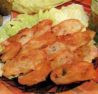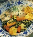 Филе семги - 150 г, вино белое - 40 г, лук - 20 г, ломтик лимона, морковь - 20 г, ломтик помидора.