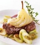 600 г мякоти свинины, 2 груши, 2 стебля лука-порея, 150 г сметаны, розмарин, 2 ст.л. топленого масла, 3 ст.л. повидла (из шиповника), карри, паприка, перец чили, соль, черный перец.