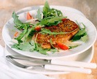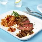 800 г говядины, 200 г рукколы, 200 г помидоров черри, 1 луковица, 1 зуб. чеснока, 200 г сметаны, 4 ст.л. горчицы, 50 мл сливок, 1 ч.л. семян горчицы, 2 ст.л. растительного масла, 50 мл белого сухого вина, 1 ст.л. измельченного фундука, 2 ст.л. тертого сыра, соль, черный молотый перец.