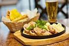 200 г телячьей вырезки, тимьян, чеснок, черный перец, 1-2 картофеля, 1 ст.л. сливок, 1 зуб. чеснока, базилик, соль.