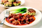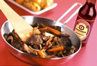 3 ст.л. подсолнечного масла, 600-700 г стейков из говядины, 3 средних луковицы, 100 г грибов, 400 г консервированных резаных томатов, 4 ст.л. соевого соуса Kikkoman, 1 ст.л. муки, 420 мл говяжьего бульона