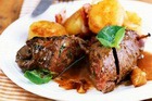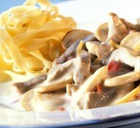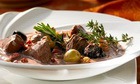 1 кг говядины, 200 г копченой свиной грудинки, 2-3 луковицы, 100 г сливочного масла, вода (бульон), 1 ст.л. муки, 200 г консервированных грибов (шампиньонов, белых), 50 г вина красного сухого, специи, соль.