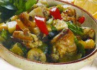 300 г свинины, 1 банан, 4 картофелины, 1 сладкий перец, соевый соус, растительное масло, молотый имбирь, черный перец, крахмал, соль.