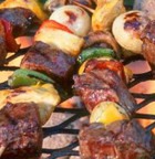 800 г мякоти баранины, 200 г свежих грибов, 16 помидорок черри, 2 болгарских перца (разноцветных), 2 огурца, 300 г репчатого лука, зелень.