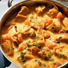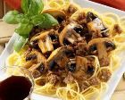 60 г муки, 500 г свинины, 1 шт. лука репчатый, 200-300 г замороженных шампиньонов, 4 ст. ложки сухого хереса, соль, перец, специи для свинины.
