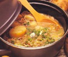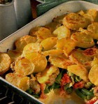 Картофель - 400 г, ветчина - 60 г, шампиньоны - 100 г, лук - 50 г, мука - 1 ч. л., сметана - 60 г, бульон - 200-300 г.