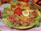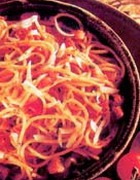 Макароны - 80 г, ветчина или сардельки - 30 г, лук репчатый - 15 г, томат-пюре - 15 г, грибы свежие - 60 г или консервированные шампиньоны - 40 г.