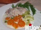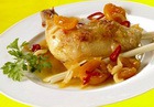 1 тушка индейки, 3 луковицы, 200 мл томатного сока, 3-4 зуб. чеснока, 1-2 сладких перца, 1 ст.л. муки, зелень петрушки и укропа, 1 лимон, 4 ст.л. топленого масла, соль, перец, сахар, 2-3 лавровых листа.
