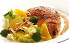 700 г филе грудок утки, 4 ягоды инжира, 100 г лука-шалота, 200 мл куриного бульона, 2 пак. вишневого желе, 1 ст.л. апельсинового сока, цедра 1 апельсина, 2 ч.л. растительного масла, соль, перец.
