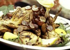 1 кг грудок идейки, 2 ст.л. растительного масла, 0,5 л овощного бульона, 60 г кедровых орешков, 3 луковицы, 1 вареное яйцо, 250 мл сухого белого вина, 100 г апельсинового джема, щепотка сахара, соль, перец.