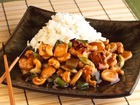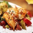 240 г риса, 2 красных луковицы, 400 г куриного филе, 2 баклажана, 2 цукини (кабачка), 2 ст.л. растительного масла, 250 г помидоров черри, 200 мл овощного бульона, тимьян, соль, перец.