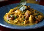 1 тушка курицы, 200 г очищенных грецких орехов, 2 ст.л. растительного масла, 200 г лука репчатого, 1 ст.л. кукурузной муки, 1/4 ч.л. гвоздики, 1/4 ч.л. корицы, зелень кинзы, чеснок, уксус, стручковый перец, соль по вкусу.