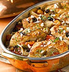 1 курица (1,5 кг), 600 г картофеля, 500 г помидоров, 500 г репчатого лука, 5-6 зуб. чеснока, 150 мл коньяка, масло растительное, соль, перец, тимьян.