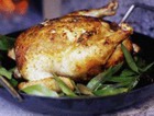 1 тушка цыпленка (1,3-1,5 кг), 5-6 зуб. чеснока, 150 мл белого сухого вина, 1 печень цыпленка, 200 г копченого сала, розмарин, масло растительное, соль, перец.