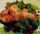 Курица, 250-300 г говяжьего фарша, 200 г клюквы, 2 луковицы, 1/2 стакана хлебных крошек, 1 яйцо, 1/2 лимона.