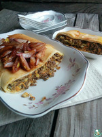 Румяные, сладкие блины с начинкой из домашнего творога и сушеной вишни.